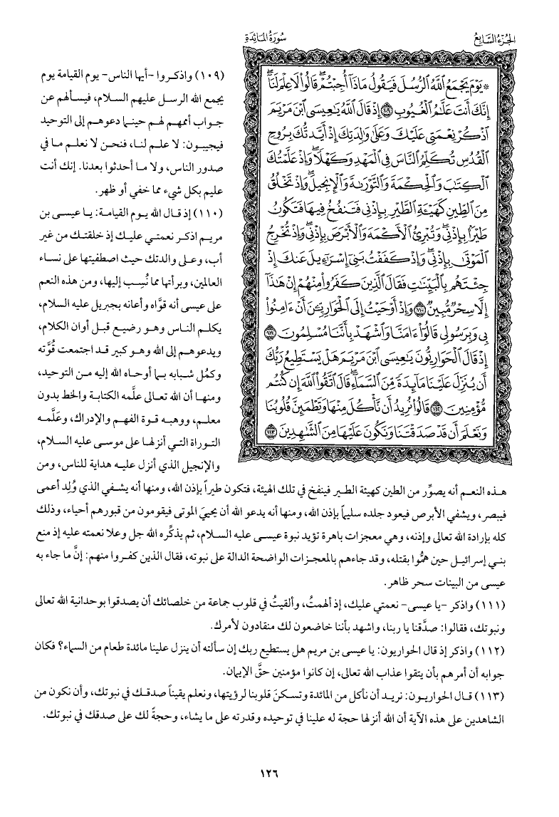 إذ قال الله يوم القيامة: يا عيسى بن مريم اذكر نعمتي عليك إذ خلقتك من غير أب، وعلى والدتك حيث اصطفيتها على نساء العالمين، وبرأتها مما نُسِب إليها، ومن هذه النعم على عيسى أنه قوَّاه وأعانه بجبريل عليه السلام، يكلم الناس وهو رضيع، ويدعوهم إلى الله وهو كبير بما أوحاه الله إليه من التوحيد، ومنها أن الله تعالى علَّمه الكتابة والخط بدون معلم، ووهبه قوة الفهم والإدراك، وعَلَّمه التوراة التي أنزلها على موسى عليه السلام، والإنجيل الذي أنزل عليه هداية للناس، ومن هذه النعم أنه يصوِّر من الطين كهيئة الطير فينفخ في تلك الهيئة، فتكون طيرًا بإذن الله، ومنها أنه يشفي الذي وُلِد أعمى فيبصر، ويشفي الأبرص، فيعود جلده سليمًا بإذن الله، ومنها أنه يدعو الله أن يحييَ الموتى فيقومون من قبورهم أحياء، وذلك كله بإرادة الله تعالى وإذنه، وهي معجزات باهرة تؤيد نبوة عيسى عليه السلام، ثم يذكِّره الله جل وعلا نعمته عليه إذ منع بني إسرائيل حين همُّوا بقتله، وقد جاءهم بالمعجزات الواضحة الدالة على نبوته، فقال الذين كفروا منهم: إنَّ ما جاء به عيسى من البينات سحر ظاهر.