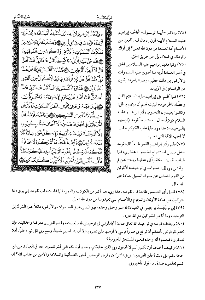 فلما رأى الشمس طالعة قال لقومه: هذا ربي، هذا أكبر من الكوكب والقمر، فلما غابت، قال لقومه: إني بريء مما تشركون من عبادة الأوثان والنجوم والأصنام التي تعبدونها من دون الله تعالى.