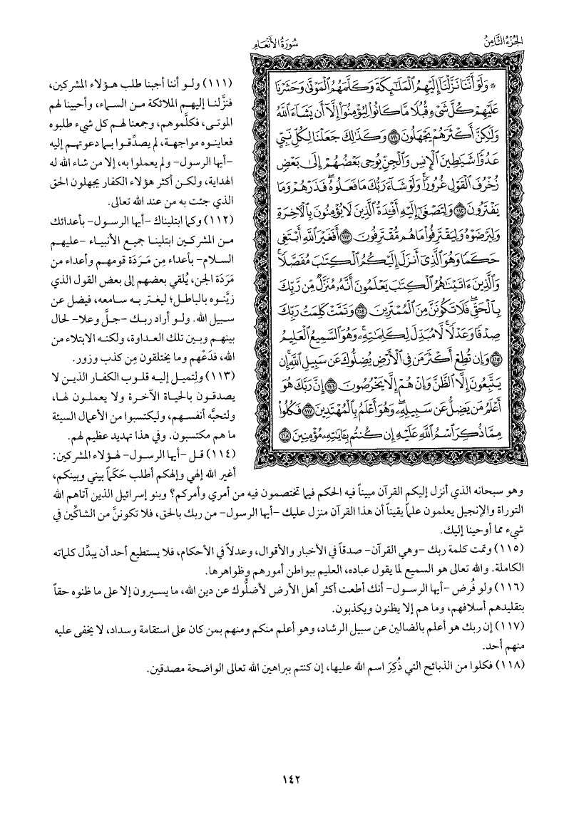 ولو أننا أجبنا طلب هؤلاء، فنزَّلنا إليهم الملائكة من السماء، وأحيينا لهم الموتى، فكلموهم، وجمعنا لهم كل شيء طلبوه فعاينوه مواجهة، لم يصدِّقوا بما دعوتهم إليه -أيها الرسول- ولم يعملوا به، إلا من شاء الله له الهداية، ولكن أكثر هؤلاء الكفار يجهلون الحق الذي جئت به من عند الله تعالى.
