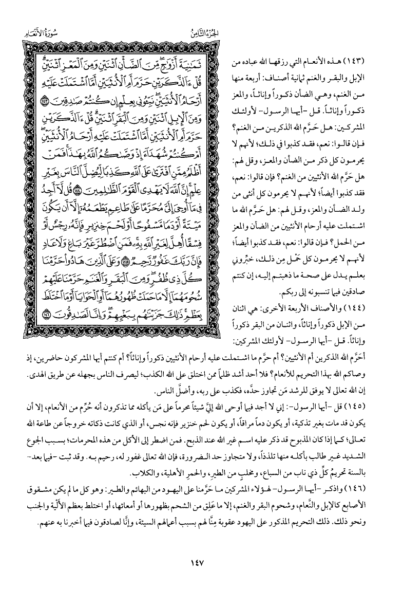 هذه الأنعام التي رزقها الله عباده من الإبل والبقر والغنم ثمانية أصناف: أربعة منها من الغنم، وهي الضأن ذكورًا وإناثًا، والمعز ذكورًا وإناثًا. قل -أيها الرسول- لأولئك المشركين: هل حَرَّم الله الذكرين من الغنم؟ فإن قالوا: نعم، فقد كذبوا في ذلك; لأنهم لا يحرمون كل ذكر من الضأن والمعز، وقل لهم: هل حَرَّم الله الأنثيين من الغنم؟ فإن قالوا: نعم، فقد كذبوا أيضًا; لأنهم لا يحرمون كل أنثى من ولد الضأن والمعز، وقل لهم: هل حَرَّم الله ما اشتملت عليه أرحام الأنثيين من الضأن والمعز من الحمل؟ فإن قالوا: نعم، فقد كذبوا أيضًا; لأنهم لا يحرمون كل حَمْل مِن ذلك، خبِّروني بعلم يدل على صحة ما ذهبتم إليه، إن كنتم صادقين فيما تنسبونه إلى ربكم.