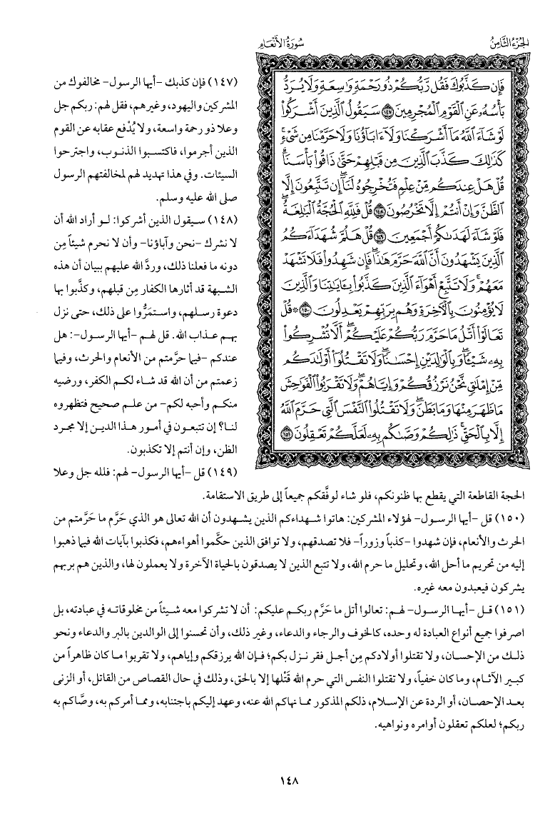 قل -أيها الرسول- لهم: تعالوا أتل ما حرم ربكم عليكم: أن لا تشركوا معه شيئًا من مخلوقاته في عبادته، بل اصرفوا جميع أنواع العبادة له وحده، كالخوف والرجاء والدعاء، وغير ذلك، وأن تحسنوا إلى الوالدين بالبر والدعاء ونحو ذلك من الإحسان، ولا تقتلوا أولادكم مِن أجل فقر نزل بكم; فإن الله يرزقكم وإياهم، ولا تقربوا ما كان ظاهرًا من كبير الآثام، وما كان خفيًّا، ولا تقتلوا النفس التي حرم الله قتلها إلا بالحق، وذلك في حال القصاص من القاتل أو الزنى بعد الإحصان أو الردة عن الإسلام، ذلكم المذكور مما نهاكم الله عنه، وعهد إليكم باجتنابه، ومما أمركم به، وصَّاكم به ربكم; لعلكم تعقلون أوامره ونواهيه.