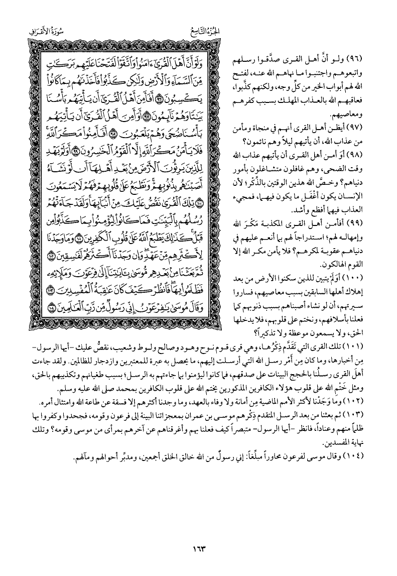 ولو أنَّ أهل القرى صدَّقوا رسلهم واتبعوهم واجتنبوا ما نهاهم الله عنه، لفتح الله لهم أبواب الخير من كلِّ وجه، ولكنهم كذَّبوا، فعاقبهم الله بالعذاب المهلك بسبب كفرهم ومعاصيهم.