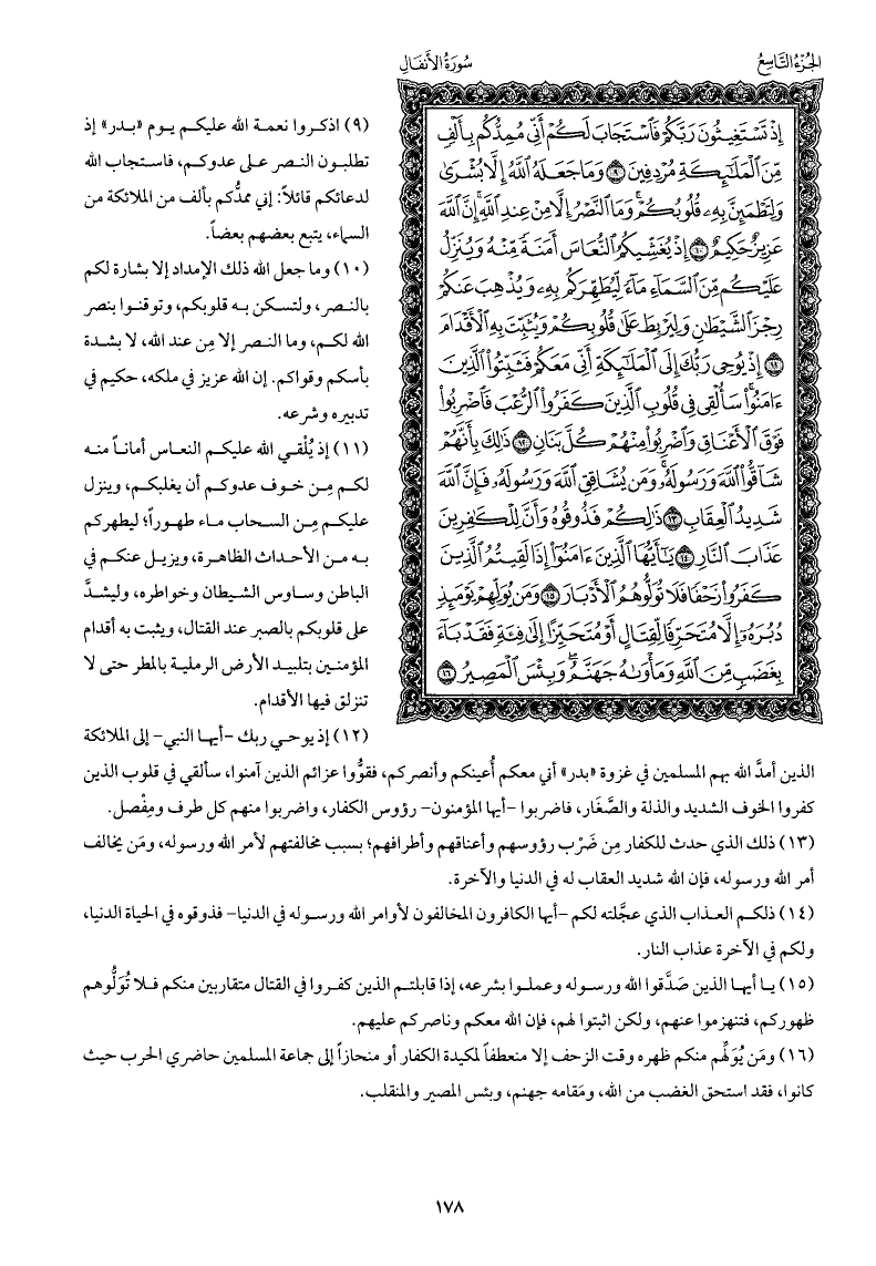 اذكروا نعمة الله عليكم يوم «بدر» إذ تطلبون النصر على عدوكم، فاستجاب الله لدعائكم قائلا إني ممدُّكم بألف من الملائكة من السماء، يتبع بعضهم بعضًا.