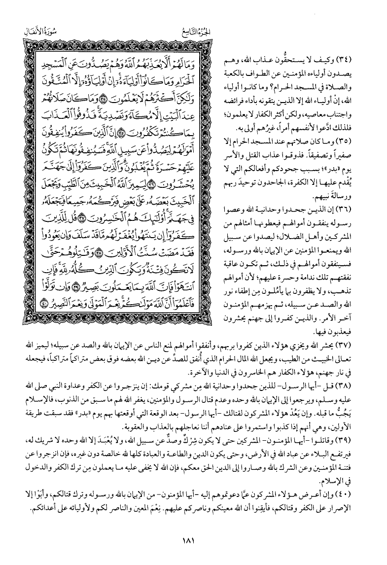 وما كان صلاتهم عند المسجد الحرام إلا صفيرًا وتصفيقًا. فذوقوا عذاب القتل والأسر يوم «بدر» ; بسبب جحودكم وأفعالكم التي لا يُقْدم عليها إلا الكفرة، الجاحدون توحيد ربهم ورسالة نبيهم.