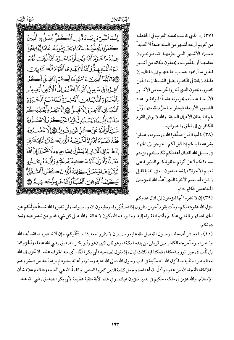 إن الذي كانت تفعله العرب في الجاهلية من تحريم أربعة أشهر من السنة عددًا لا تحديدًا بأسماء الأشهر التي حرَّمها الله، فيؤخرون بعضها أو يقدِّمونه ويجعلون مكانه من أشهر الحل ما أرادوا حسب حاجتهم للقتال، إن ذلك زيادة في الكفر، يضل الشيطان به الذين كفروا، يحلون الذي أخروا تحريمه من الأشهر الأربعة عامًا، ويحرمونه عاما; ليوافقوا عدد الشهور الأربعة، فيحلوا ما حرَّم الله منها. زَيَّن لهم الشيطان الأعمال السيئة. والله لا يوفق القوم الكافرين إلى الحق والصواب.