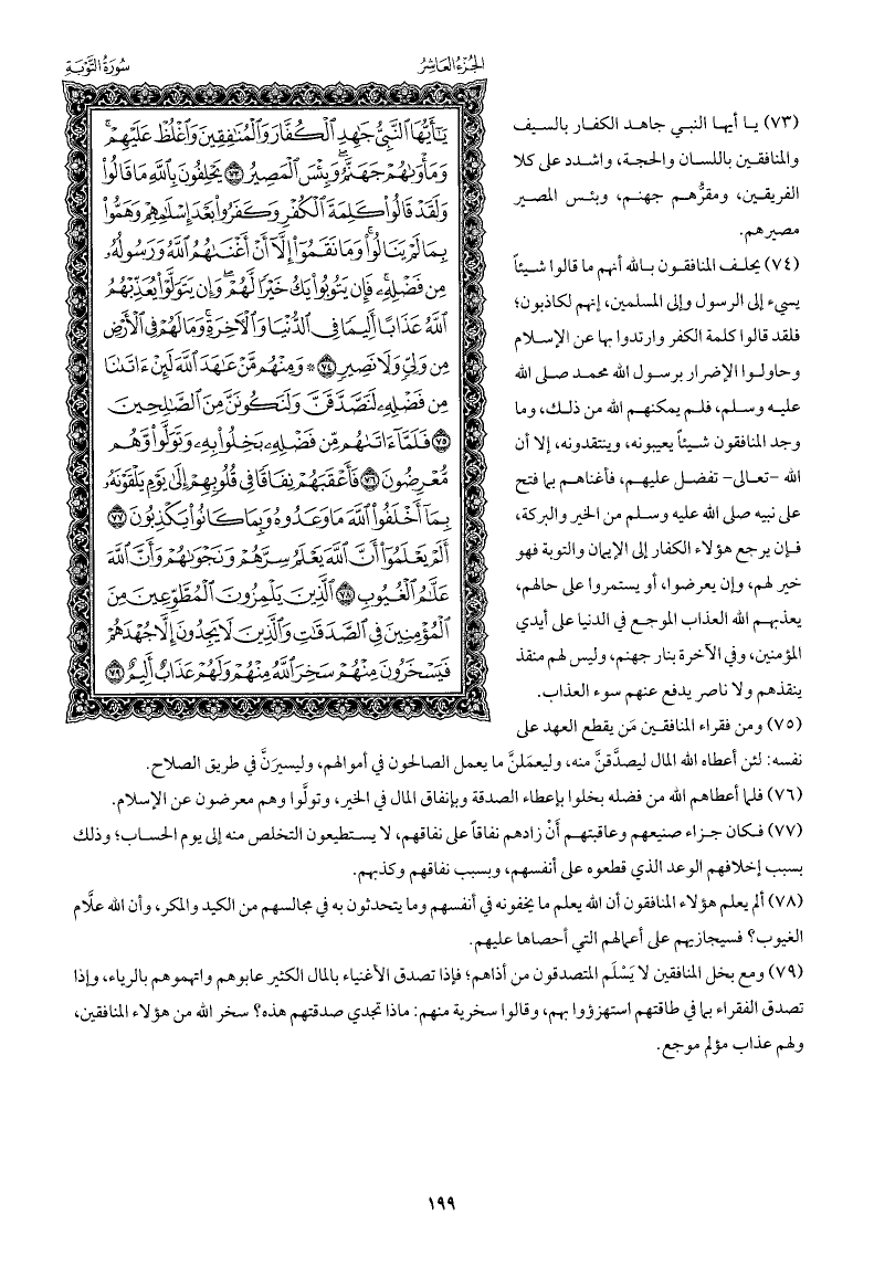 يا أيها النبي جاهد الكفار بالسيف والمنافقين باللسان والحجة، واشدد على كلا الفريقين، ومقرُّهم جهنم، وبئس المصير مصيرهم.
