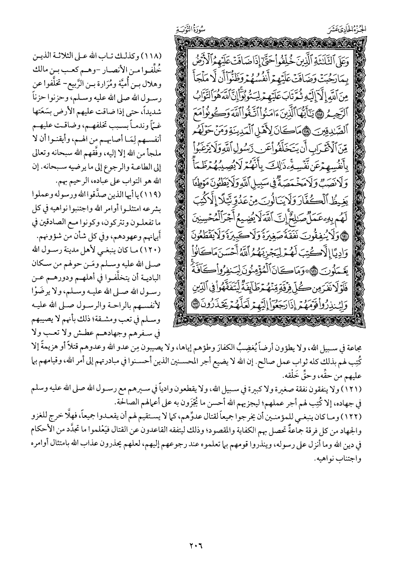 وكذلك تاب الله على الثلاثة الذين خُلِّفوا من الأنصار -وهم كعب بن مالك وهلال بن أُميَّة ومُرَارة بن الربيع- تخلَّفوا عن رسول الله صلى الله عليه وسلم، وحزنوا حزنًا شديدًا، حتى إذا ضاقت عليهم الأرض بسَعَتها غمًّا وندمًا بسبب تخلفهم، وضاقت عليهم أنفسهم لِمَا أصابهم من الهم، وأيقنوا أن لا ملجأ من الله إلا إليه، وفَّقهم الله سبحانه وتعالى إلى الطاعة والرجوع إلى ما يرضيه سبحانه. إن الله هو التواب على عباده، الرحيم بهم.