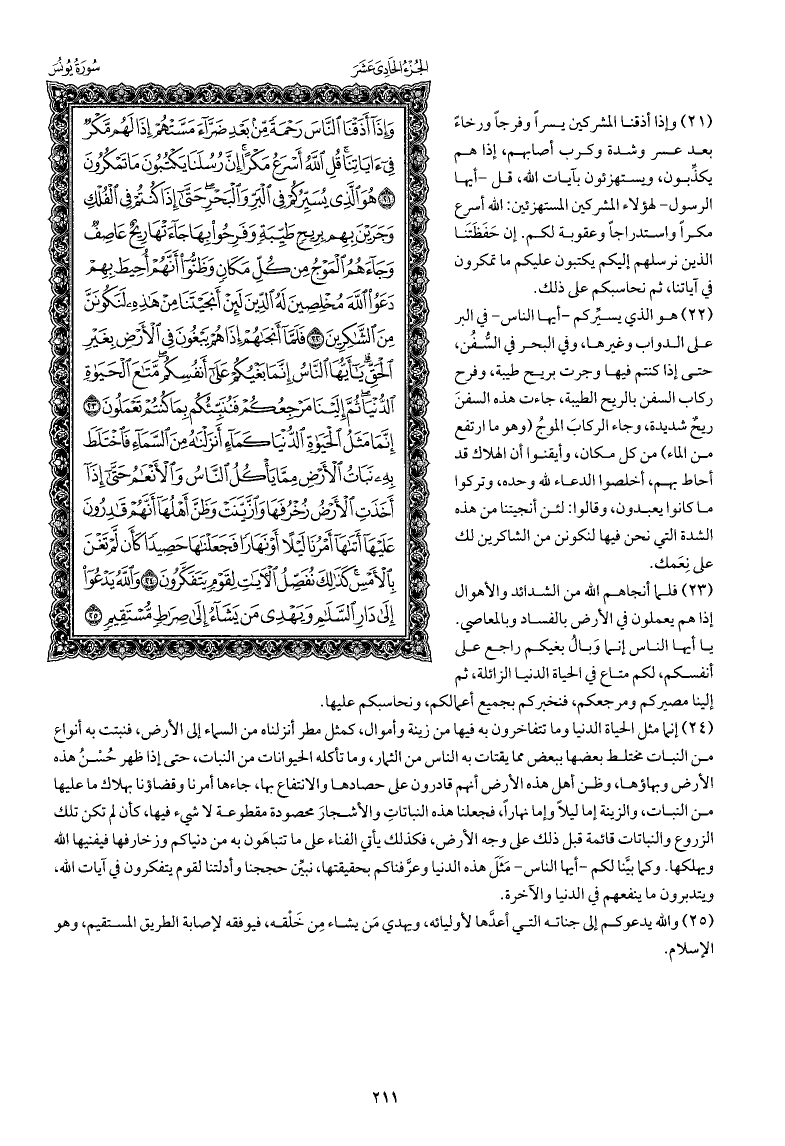 هو الذي يسيِّركم -أيها الناس- في البر على الدواب وغيرها، وفي البحر في السُّفُن، حتى إذا كنتم فيها وجرت بريح طيبة، وفرح ركاب السفن بالريح الطيبة، جاءت هذه السفنَ ريحٌ شديدة، وجاء الركابَ الموجُ (وهو ما ارتفع من الماء) من كل مكان، وأيقنوا أن الهلاك قد أحاط بهم، أخلصوا الدعاء لله وحده، وتركوا ما كانوا يعبدون، وقالوا: لئن أنجيتنا من هذه الشدة التي نحن فيها لنكونن من الشاكرين لك على نِعَمك.