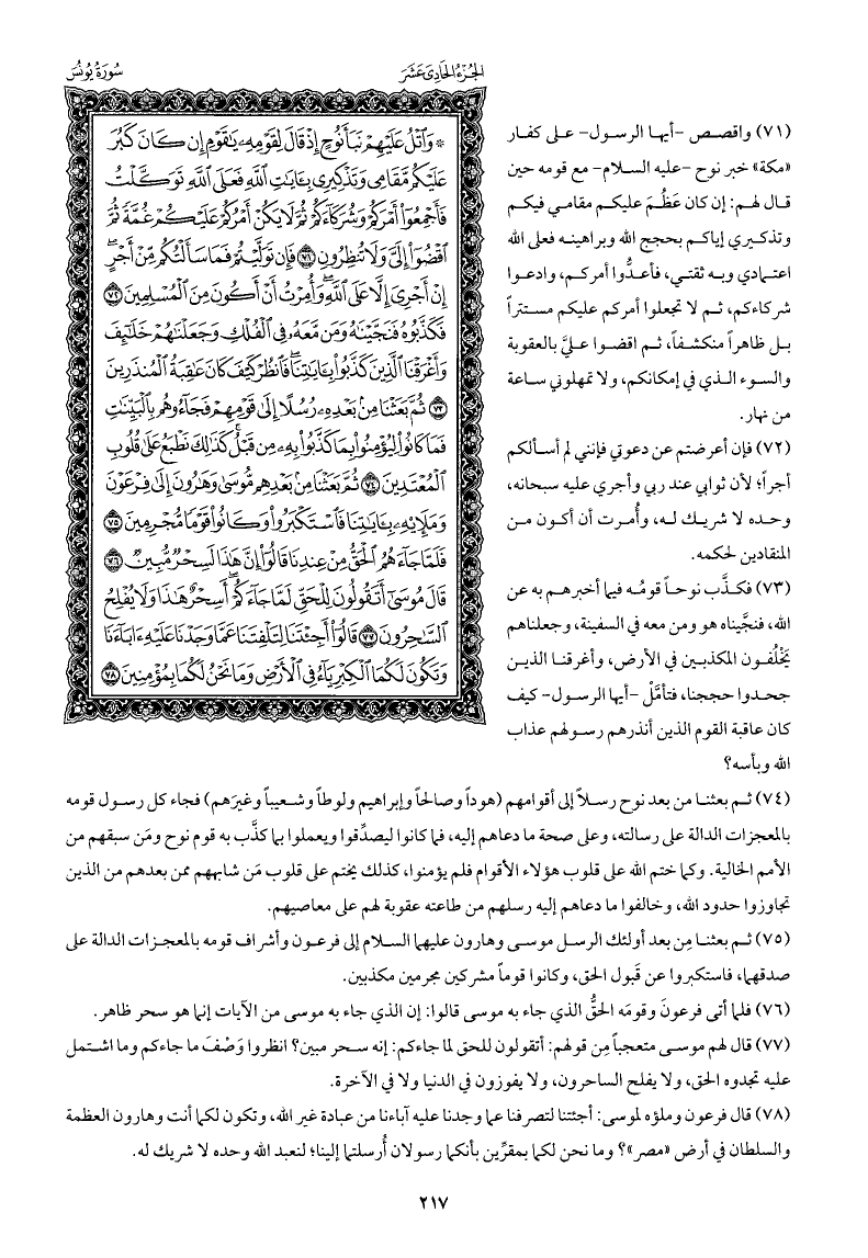 واقصص -أيها الرسول- على كفار «مكة» خبر نوح -عليه السلام- مع قومه حين قال لهم: إن كان عَظُمَ عليكم مقامي فيكم وتذكيري إياكم بحجج الله وبراهينه فعلى الله اعتمادي وبه ثقتي، فأعدُّوا أمركم، وادعوا شركاءكم، ثم لا تجعلوا أمركم عليكم مستترًا بل ظاهرًا منكشفًا، ثم اقضوا عليَّ بالعقوبة والسوء الذي في إمكانكم، ولا تمهلوني ساعة من نهار.