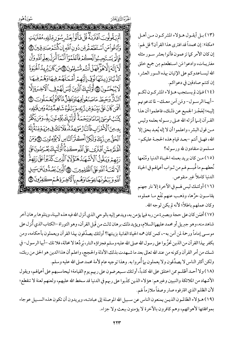 أفمَن كان على حجة وبصيرة من ربه فيما يؤمن به، ويدعو إليه بالوحي الذي أنزل الله فيه هذه البينة، ويتلوها برهان آخر شاهد منه، وهو جبريل أو محمد عليهما السلام، ويؤيد ذلك برهان ثالث من قبل القرآن، وهو التوراة -الكتاب الذي أنزل على موسى إمامًا ورحمة لمن آمن به-، كمن كان همه الحياة الفانية بزينتها؟ أولئك يصدِّقون بهذا القرآن ويعملون بأحكامه، ومن يكفر بهذا القرآن من الذين تحزَّبوا على رسول الله صلى الله عليه وسلم فجزاؤه النار، يَرِدُها لا محالة، فلا تك -أيها الرسول- في شك من أمر القرآن وكونه من عند الله تعالى بعد ما شهدت بذلك الأدلة والحجج، واعلم أن هذا الدين هو الحق من ربك، ولكن أكثر الناس لا يصدِّقون ولا يعملون بما أُمروا به. وهذا توجيه عام لأمة محمد صلى الله عليه وسلم.