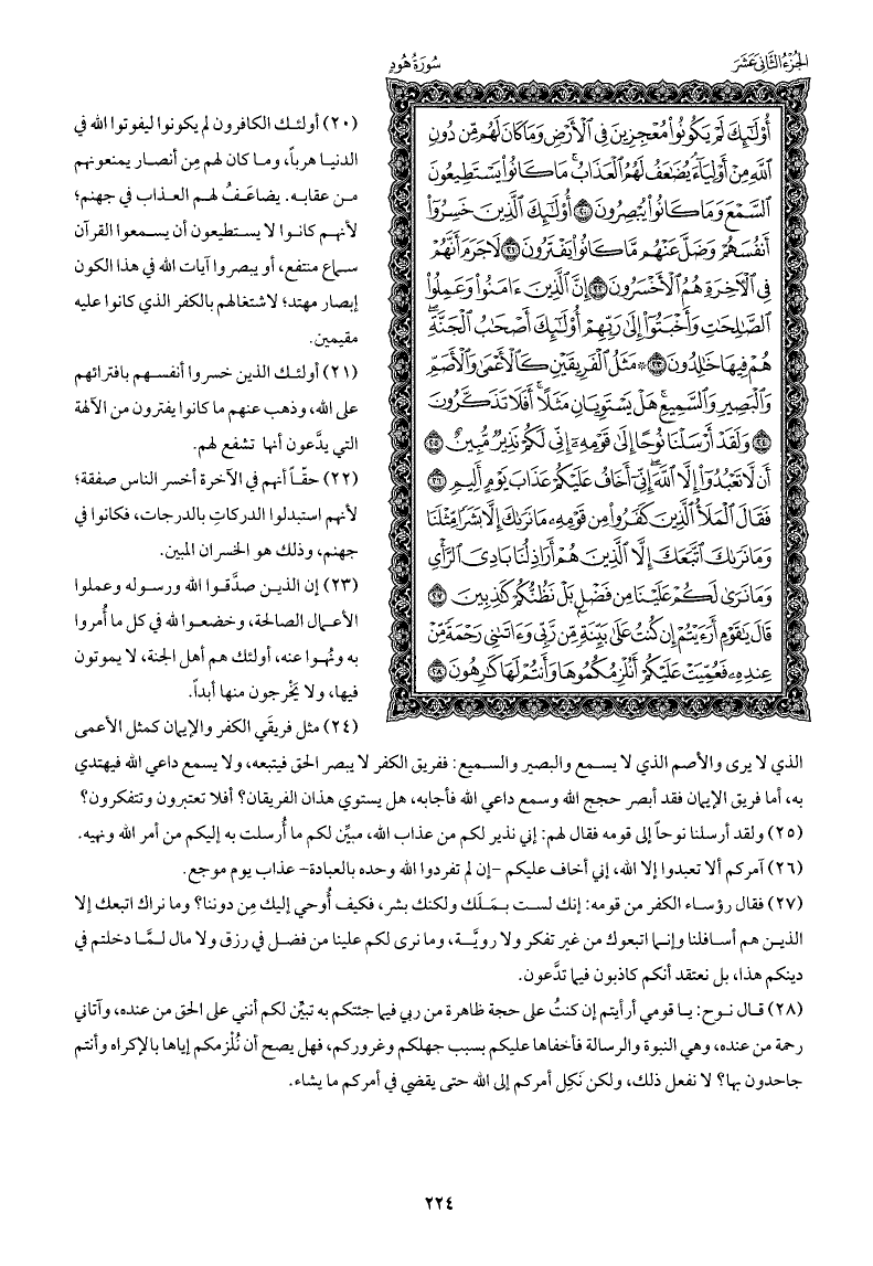 أولئك الكافرون لم يكونوا ليفوتوا الله في الدنيا هربًا، وما كان لهم مِن أنصار يمنعونهم من عقابه. يضاعَفُ لهم العذاب في جهنم; لأنهم كانوا لا يستطيعون أن يسمعوا القرآن سماع منتفع، أو يبصروا آيات الله في هذا الكون إبصار مهتد; لاشتغالهم بالكفر الذي كانوا عليه مقيمين.