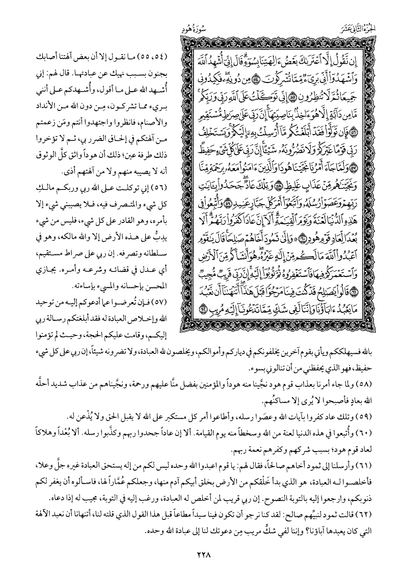 ما نقول إلا أن بعض آلهتنا أصابك بجنون بسبب نهيك عن عبادتها. قال لهم: إني أُشهد الله على ما أقول، وأُشهدكم على أنني بريء مما تشركون، مِن دون الله من الأنداد والأصنام، فانظروا واجتهدوا أنتم ومَن زعمتم من آلهتكم في إلحاق الضرر بي، ثم لا تؤخروا ذلك طرفة عين؛ ذلك أن هودًا واثق كل الوثوق أنه لا يصيبه منهم ولا من آلهتهم أذى.