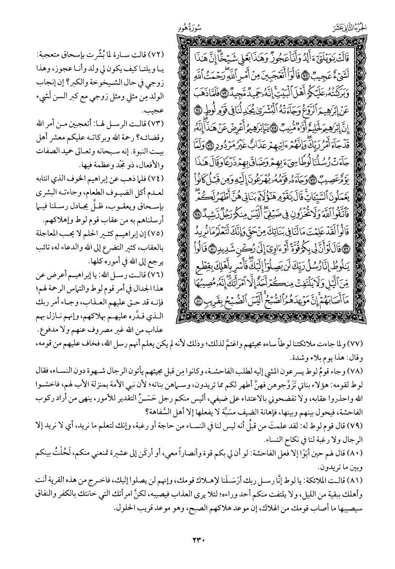 وجاء قومُ لوط يسرعون المشي إليه لطلب الفاحشة، وكانوا مِن قبل مجيئهم يأتون الرجال شهوة دون النساء، فقال لوط لقومه: هؤلاء بناتي تَزَوَّجوهن فهنَّ أطهر لكم مما تريدون، وسماهن بناته; لأن نبي الأمة بمنزلة الأب لهم، فاخشوا الله واحذروا عقابه، ولا تفضحوني بالاعتداء على ضيفي، أليس منكم رجل ذو رشد، ينهى من أراد ركوب الفاحشة، فيحول بينهم وبينها، فإهانة الضيف مسبة لا يفعلها إلا أهل السفاهة؟