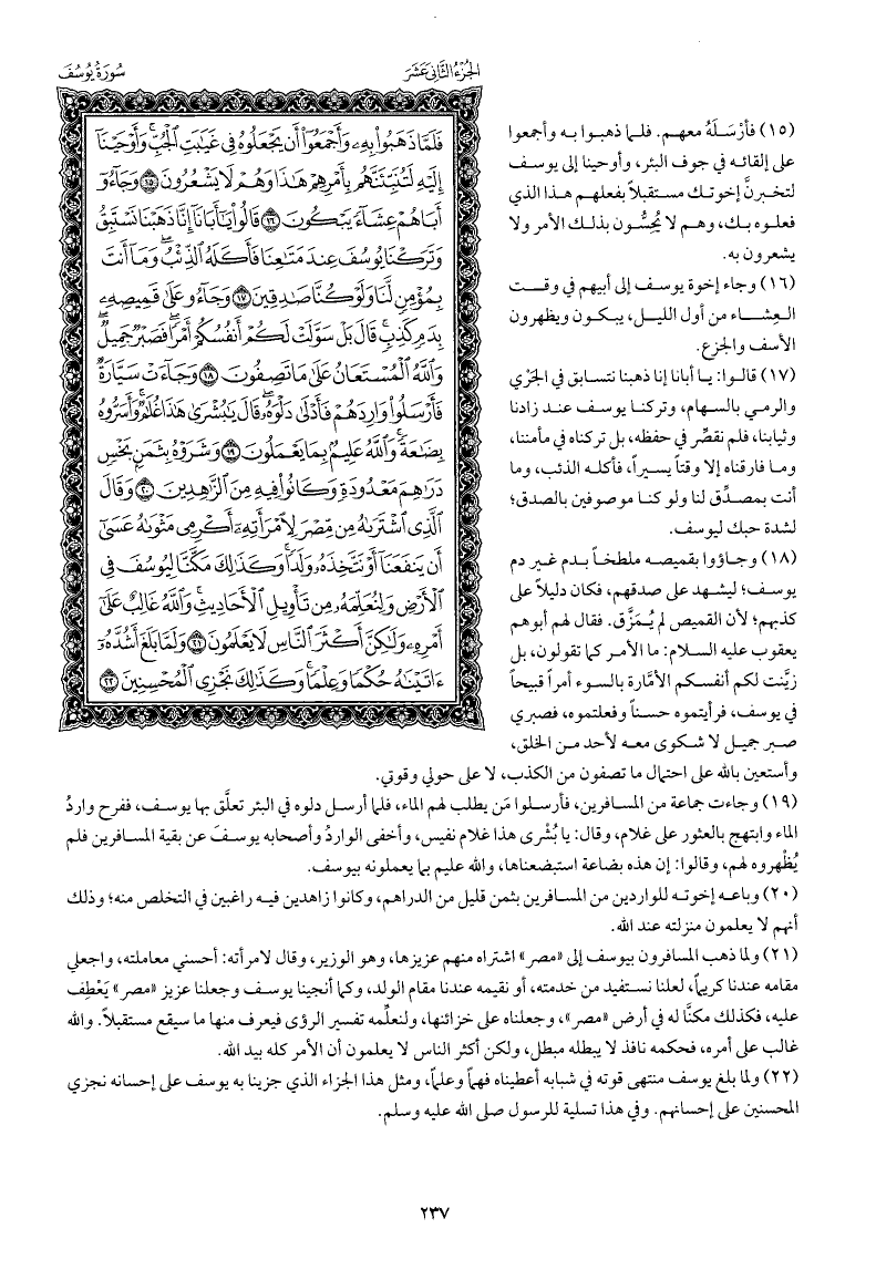 وجاؤوا بقميصه ملطخًا بدم غير دم يوسف; ليشهد على صدقهم، فكان دليلا على كذبهم; لأن القميص لم يُمَزَّقْ. فقال لهم أبوهم يعقوب عليه السلام: ما الأمر كما تقولون، بل زيَّنت لكم أنفسكم الأمَّارة بالسوء أمرًا قبيحًا في يوسف، فرأيتموه حسنًا وفعلتموه، فصبري صبر جميل لا شكوى معه لأحد من الخلق، وأستعين بالله على احتمال ما تصفون من الكذب، لا على حولي وقوتي.