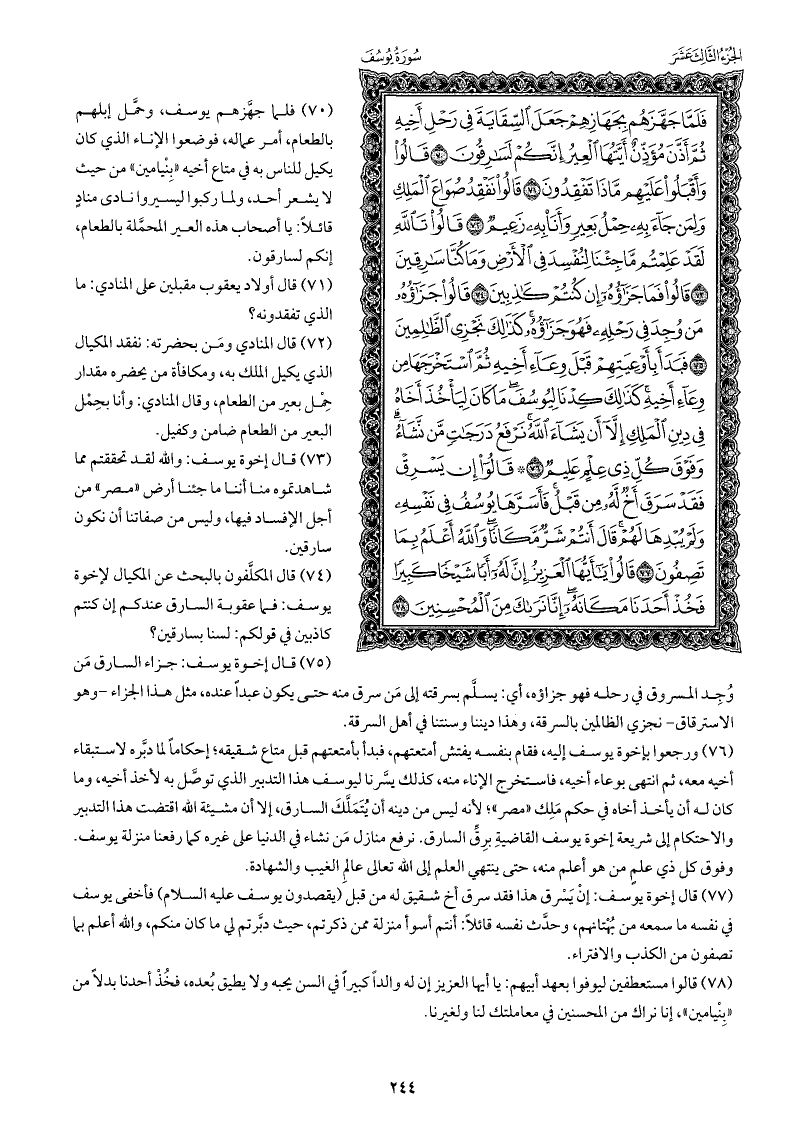 فلما جهزَّهم يوسف، وحمَّل إبلهم بالطعام، أمر عماله، فوضعوا الإناء الذي كان يكيل للناس به في متاع أخيه «بنيامين» من حيث لا يشعر أحد، ولما ركبوا ليسيروا نادى منادٍ قائلا يا أصحاب هذه العير المحمَّلة بالطعام، إنكم لسارقون.