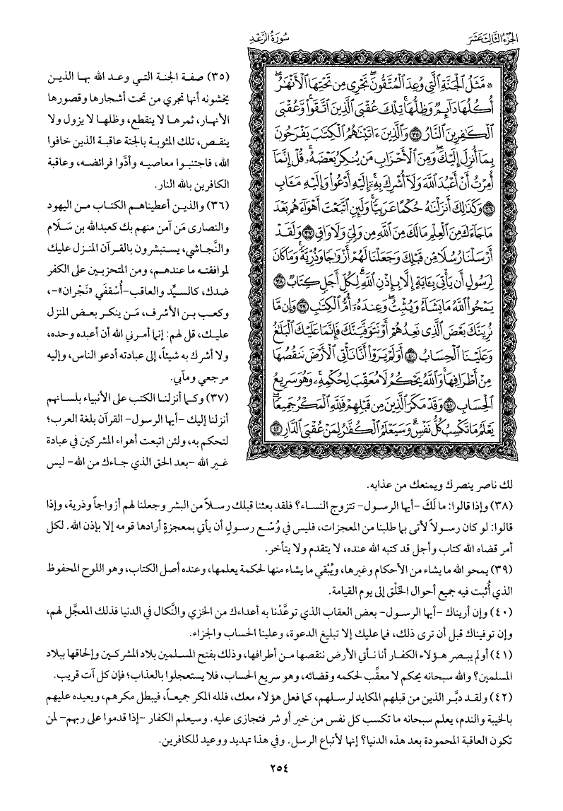 صفة الجنة التي وعد الله بها الذين يخشونه أنها تجري من تحت أشجارها وقصورها الأنهار، ثمرها لا ينقطع، وظلها لا يزول ولا ينقص، تلك المثوبة بالجنة عاقبة الذين خافوا الله، فاجتنبوا معاصيه وأدَّوا فرائضه، وعاقبة الكافرين بالله النار.