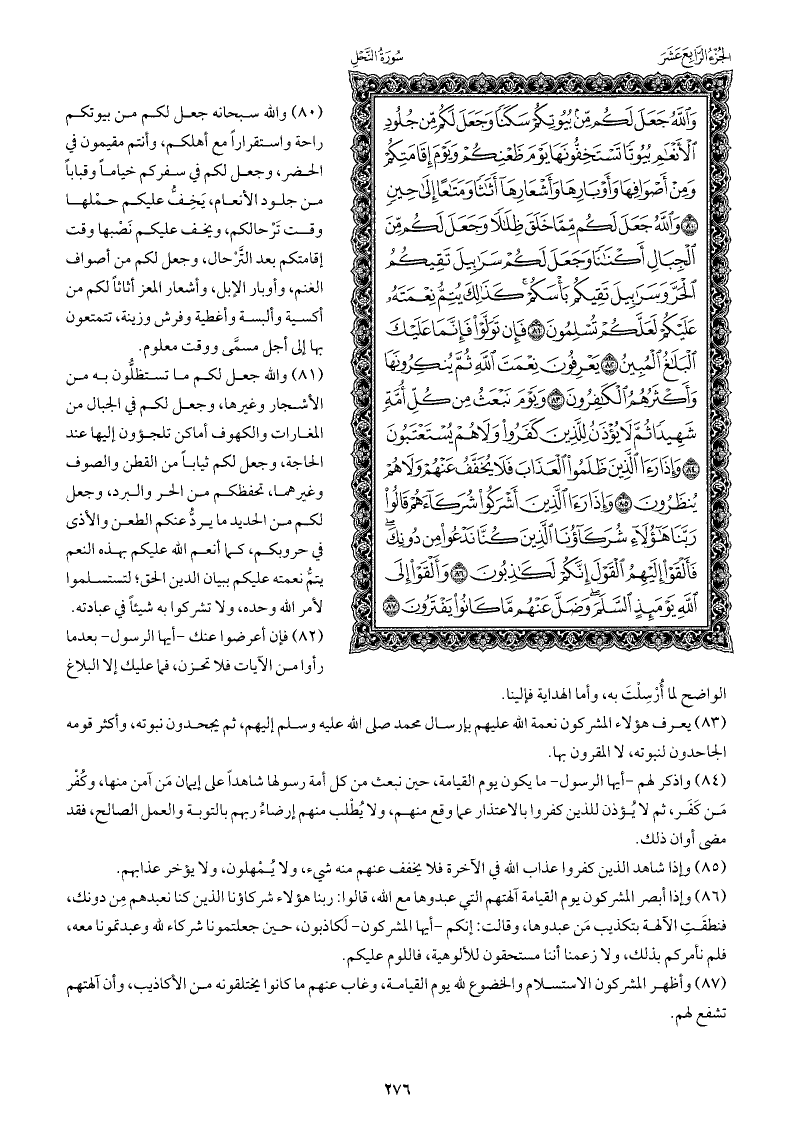 والله سبحانه جعل لكم من بيوتكم راحة واستقرارًا مع أهلكم، وأنتم مقيمون في الحضر، وجعل لكم في سفركم خيامًا وقبابًا من جلود الأنعام، يَخِفُّ عليكم حِمْلها وقت تَرْحالكم، ويخف عليكم نَصْبها وقت إقامتكم بعد التَّرْحال، وجعل لكم من أصواف الغنم، وأوبار الإبل، وأشعار المعز أثاثًا لكم من أكسية وألبسة وأغطية وفرش وزينة، تتمتعون بها إلى أجل مسمَّى ووقت معلوم.