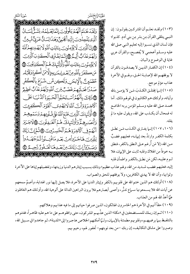 ولقد نعلم أن المشركين يقولون: إن النبي يتلقى القرآن مِن بشر مِن بني آدم. كذبوا; فإن لسان الذي نسبوا إليه تعليم النبي صلى الله عليه وسلم أعجمي لا يُفصح، والقرآن عربي غاية في الوضوح والبيان.