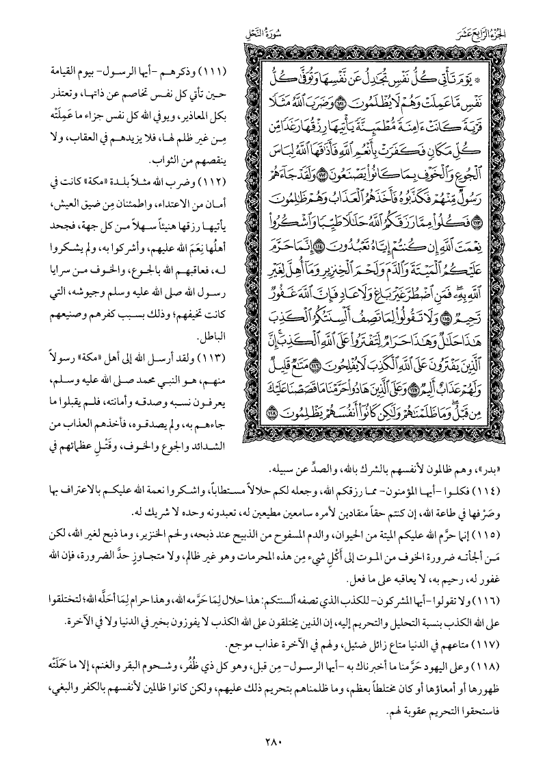 وضرب الله مثلا بلدة «مكة» كانت في أمان من الاعتداء، واطمئنان مِن ضيق العيش، يأتيها رزقها هنيئًا سهلا من كل جهة، فجحد أهلُها نِعَمَ الله عليهم، وأشركوا به، ولم يشكروا له، فعاقبهم الله بالجوع، والخوف من سرايا رسول الله صلى الله عليه وسلم وجيوشه، التي كانت تخيفهم; وذلك بسبب كفرهم وصنيعهم الباطل.
