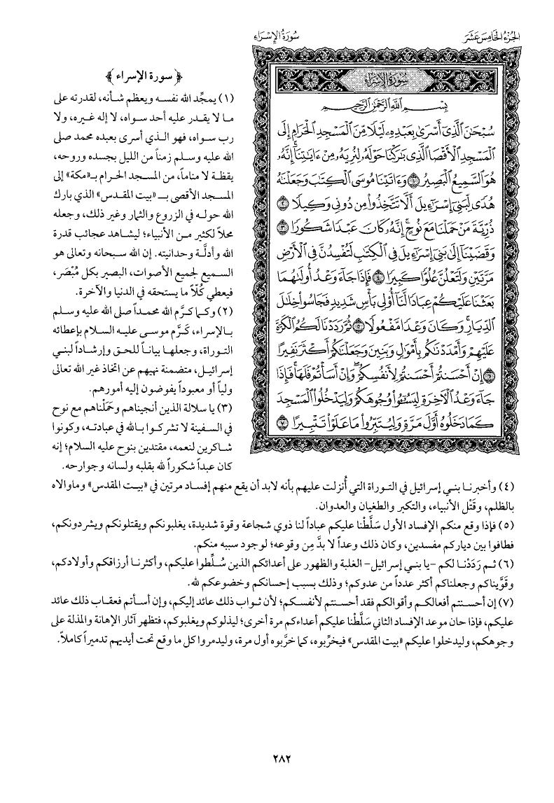 يمجِّد الله نفسه ويعظم شأنه، لقدرته على ما لا يقدر عليه أحد سواه، لا إله غيره، ولا رب سواه، فهو الذي أسرى بعبده محمد صلى الله عليه وسلم زمنًا من الليل بجسده وروحه، يقظة لا منامًا، من المسجد الحرام بـ «مكة» إلى المسجد الأقصى بـ «بيت المقدس» الذي بارك الله حوله في الزروع والثمار وغير ذلك، وجعله محلا لكثير من الأنبياء؛ ليشاهد عجائب قدرة الله وأدلة وحدانيته. إن الله سبحانه وتعالى هو السميع لجميع الأصوات، البصير بكل مُبْصَر، فيعطي كُلا ما يستحقه في الدنيا والآخرة.