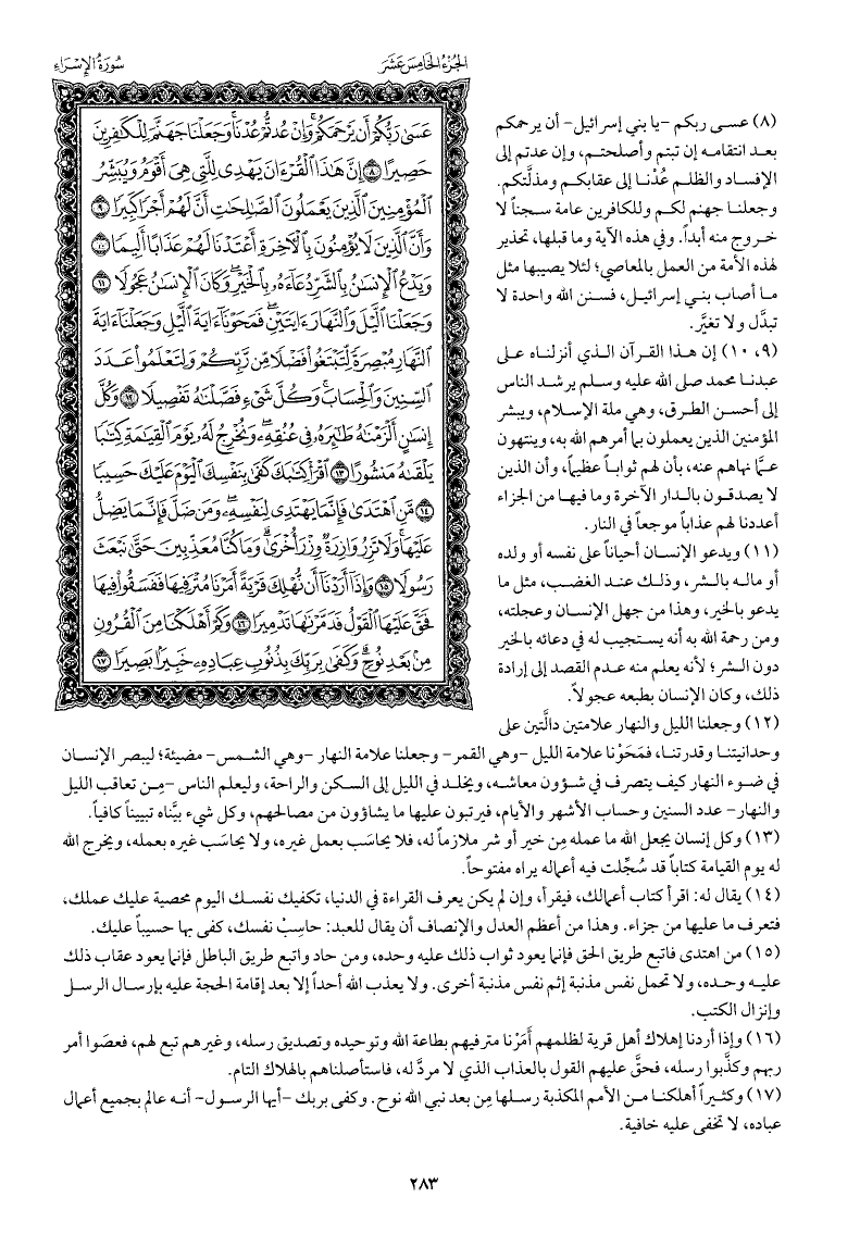 عسى ربكم -يا بني إسرائيل- أن يرحمكم بعد انتقامه إن تبتم وأصلحتم، وإن عدتم إلى الإفساد والظلم عُدْنا إلى عقابكم ومذلَّتكم. وجعلنا جهنم لكم وللكافرين عامة سجنًا لا خروج منه أبدا. وفي هذه الآية وما قبلها، تحذير لهذه الأمة من العمل بالمعاصي؛ لئلا يصيبها مثل ما أصاب بني إسرائيل، فسنن الله واحدة لا تبدل ولا تغير.