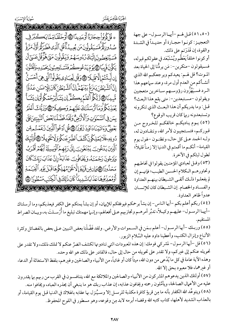 أو كونوا خلقًا يَعْظُم ويُسْتَبْعَد في عقولكم قبوله فسيقولون -منكرين-: مَن يردُّنا إلى الحياة بعد الموت؟ قل لهم: يعيدكم ويرجعكم الله الذي أنشأكم من العدم أول مرة، وعند سماعهم هذا الرد فسيَهُزُّون رؤوسهم ساخرين متعجبين ويقولون -مستبعدين-: متى يقع هذا البعث؟ قل: وما يدريكم أن هذا البعث الذي تنكرونه وتستبعدونه ربما كان قريب الوقوع.