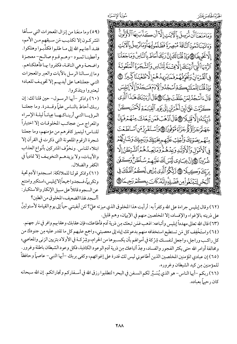 واذكر -أيها الرسول- حين قلنا لك: إن ربك أحاط بالناس علمًا وقدرة. وما جعلنا الرؤيا التي أريناكها عِيانًا ليلة الإسراء والمعراج من عجائب المخلوقات إلا اختبارًا للناس؛ ليتميز كافرهم من مؤمنهم، وما جعلنا شجرة الزقوم الملعونة التي ذكرت في القرآن إلا ابتلاء للناس. ونخوِّف المشركين بأنواع العذاب والآيات، ولا يزيدهم التخويف إلا تماديًا في الكفر والضلال.