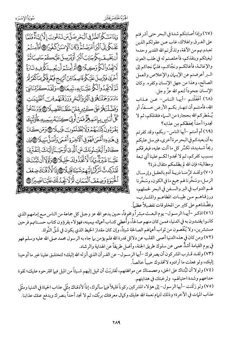 وإذا أصابتكم شدة في البحر حتى أشرفتم على الغرق والهلاك، غاب عن عقولكم الذين تعبدونهم من الآلهة، وتذكَّرتم الله القدير وحده؛ ليغيثكم وينقذكم، فأخلصتم له في طلب العون والإغاثة، فأغاثكم ونجَّاكم، فلمَّا نجاكم إلى البر أعرضتم عن الإيمان والإخلاص والعمل الصالح، وهذا من جهل الإنسان وكفره. وكان الإنسان جحودًا لنعم الله عزَّ وجل.