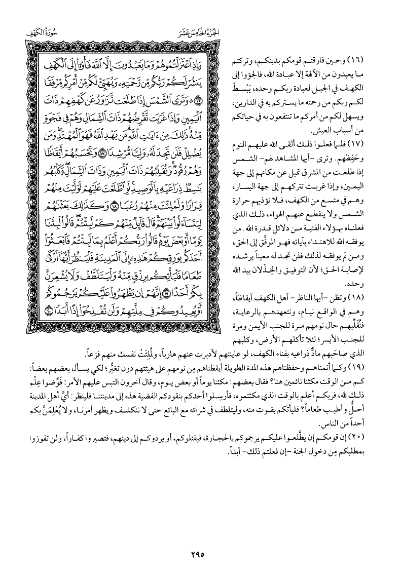 وتظن -أيها الناظر- أهل الكهف أيقاظًا، وهم في الواقع نيام، ونتعهدهم بالرعاية، فنُقَلِّبهم حال نومهم مرة للجنب الأيمن ومرة للجنب الأيسر؛ لئلا تأكلهم الأرض، وكلبهم الذي صاحَبهم مادٌّ ذراعيه بفناء الكهف، لو عاينتهم لأدبرت عنهم هاربًا، ولَمُلِئَتْ نفسك منهم فزعًا.