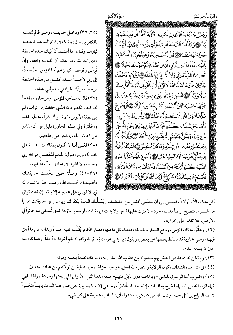 ودخل حديقته، وهو ظالم لنفسه بالكفر بالبعث، وشكه في قيام الساعة، فأعجبته ثمارها وقال: ما أعتقد أن تَهْلِك هذه الحديقة مدى الحياة، وما أعتقد أن القيامة واقعة، وإن فُرِضَ وقوعها -كما تزعم أيها المؤمن- ورُجعتُ إلى ربي لأجدنَّ عنده أفضل من هذه الحديقة مرجعًا ومردًا؛ لكرامتي ومنزلتي عنده.