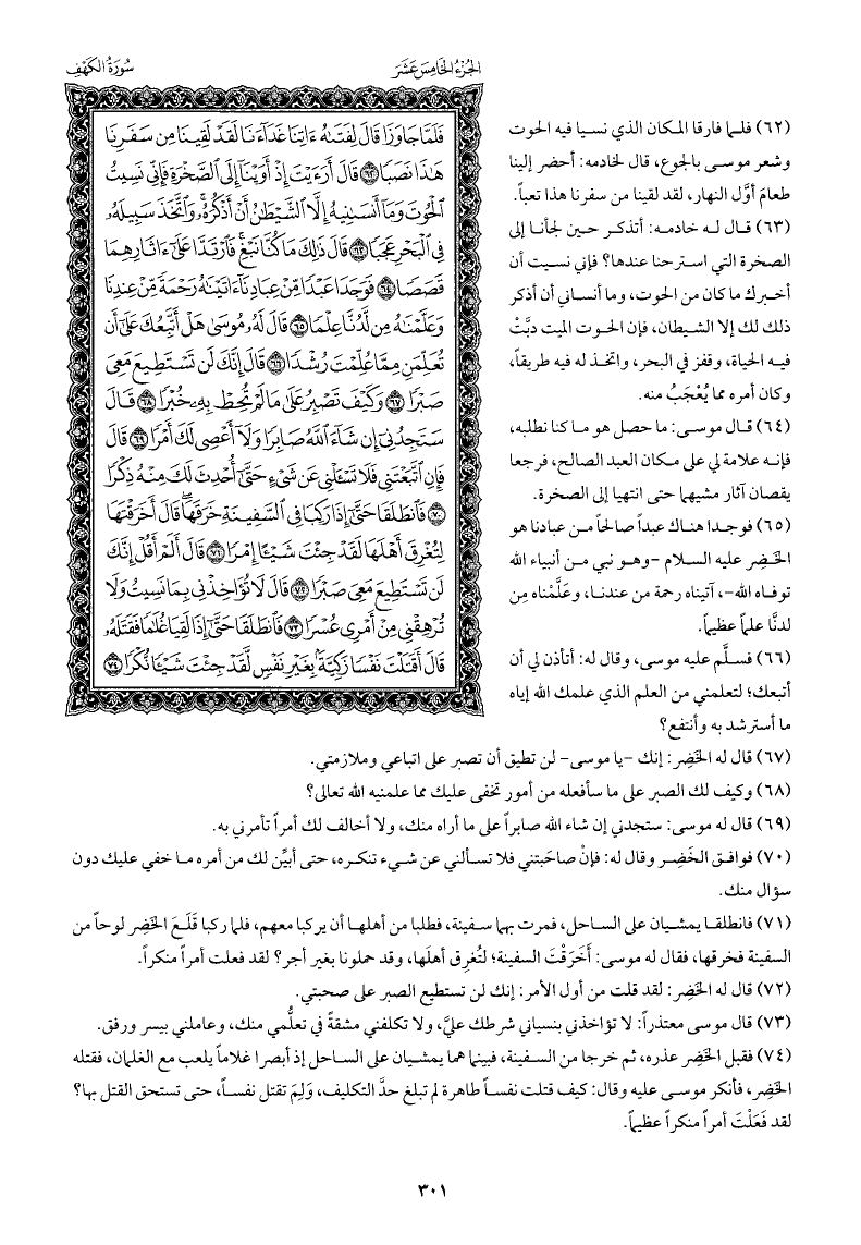 فوافق الخَضِر وقال له: فإنْ صاحَبتني فلا تسألني عن شيء تنكره، حتى أبيِّن لك من أمره ما خفي عليك دون سؤال منك.