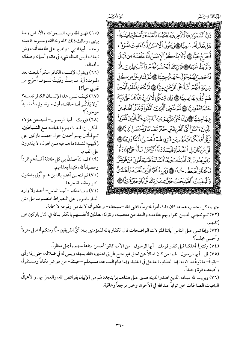 فوربك - أيها الرسول - لنجمعن هؤلاء المنكرين للبعث يوم القيامة مع الشياطين، ثم لنأتين بهم أجمعين حول جهنم باركين على رُكَبهم; لشدة ما هم فيه من الهول، لا يقدرون على القيام.