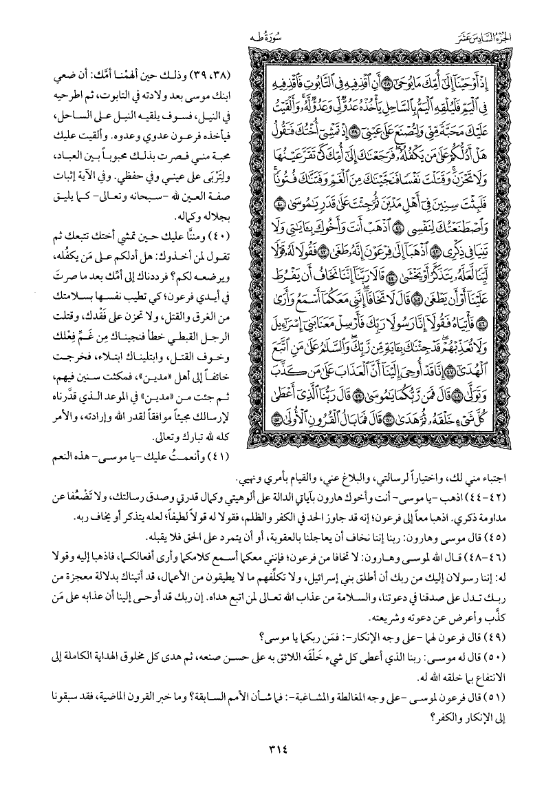 ومننَّا عليك حين تمشي أختك تتبعك ثم تقول لمن أخذوك: هل أدلكم على من يكفُله، ويرضعه لكم؟ فرددناك إلى أمِّك بعد ما صرتَ في أيدي فرعون؛ كي تطيب نفسها بسلامتك من الغرق والقتل، ولا تحزن على فَقْدك، وقتلت الرجل القبطي خطأ فنجيناك من غَمِّ فِعْلك وخوف القتل، وابتليناك ابتلاء، فخرجت خائفًا إلى أهل «مدين» ، فمكثت سنين فيهم، ثم جئت من «مدين» في الموعد الذي قدَّرناه لإرسالك مجيئًا موافقًا لقدر الله وإرادته، والأمر كله لله تبارك وتعالى.