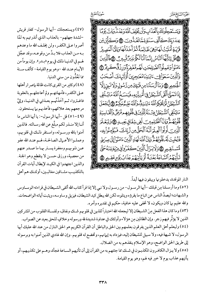 قل - أيها الرسول -: يا أيها الناس ما أنا إلا منذر لكم مبلِّغ عن الله رسالته. فالذين آمنوا بالله ورسوله، واستقر ذلك في قلوبهم، وعملوا الأعمال الصالحة، لهم عند الله عفو عن ذنوبهم ومغفرة يستر بها ما صدر عنهم من معصية، ورزق حسن لا ينقطع وهو الجنة. والذين اجتهدوا في الكيد لإبطال آيات القرآن بالتكذيب مشاقين مغالبين، أولئك هم أهل النار الموقدة، يدخلونها ويبقون فيها أبدًا.