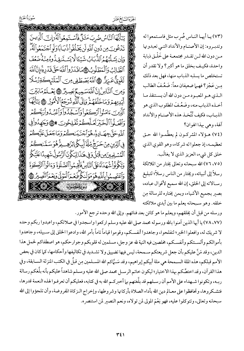 يا أيها الذين آمنوا بالله ورسوله محمد صلى الله عليه وسلم اركعوا واسجدوا في صلاتكم، واعبدوا ربكم وحده لا شريك له، وافعلوا الخير; لتفلحوا، وجاهدوا أنفسكم، وقوموا قيامًا تامًّا بأمر الله، وادعوا الخلق إلى سبيله، وجاهدوا بأموالكم وألسنتكم وأنفسكم، مخلصين فيه النية لله عز وجل، مسلمين له قلوبكم وجوارحكم، هو اصطفاكم لحمل هذا الدين، وقد منَّ عليكم بأن جعل شريعتكم سمحة، ليس فيها تضييق ولا تشديد في تكاليفها وأحكامها، كما كان في بعض الأمم قبلكم، هذه الملة السمحة هي ملة أبيكم إبراهيم، وقد سَمَّاكم الله المسلمين مِن قبلُ في الكتب المنزلة السابقة، وفي هذا القرآن، وقد اختصَّكم بهذا الاختيار ; ليكون خاتم الرسل محمد صلى الله عليه وسلم شاهدًا عليكم بأنه بلَّغكم رسالة ربه، وتكونوا شهداء على الأمم أن رسلهم قد بلَّغتهم بما أخبركم الله به في كتابه، فعليكم أن تعرفوا لهذه النعمة قدرها، فتشكروها، وتحافظوا على معالم دين الله بأداء الصلاة بأركانها وشروطها، وإخراج الزكاة المفروضة، وأن تلجؤوا إلى الله سبحانه وتعالى، وتتوكلوا عليه، فهو نِعْمَ المولى لمن تولاه، ونعم النصير لمن استنصره.