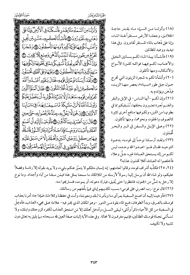 وأنزلنا من السماء ماء بقدر حاجة الخلائق، وجعلنا الأرض مستقرًا لهذا الماء، وإنا على ذَهاب بالماء المستقر لَقادرون. وفي هذا تهديد ووعيد للظالمين.