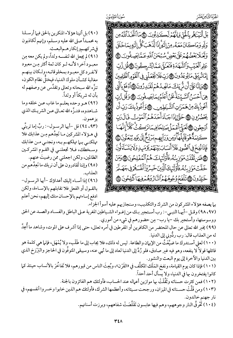 لم يجعل الله لنفسه ولدًا، ولم يكن معه من معبود آخر; لأنه لو كان ثمة أكثر مِن معبود لانفرد كل معبود بمخلوقاته، ولكان بينهم مغالبة كشأن ملوك الدنيا، فيختلُّ نظام الكون، تنزَّه الله سبحانه وتعالى وتقدَّس عن وصفهم له بأن له شريكًا أو ولدًا.