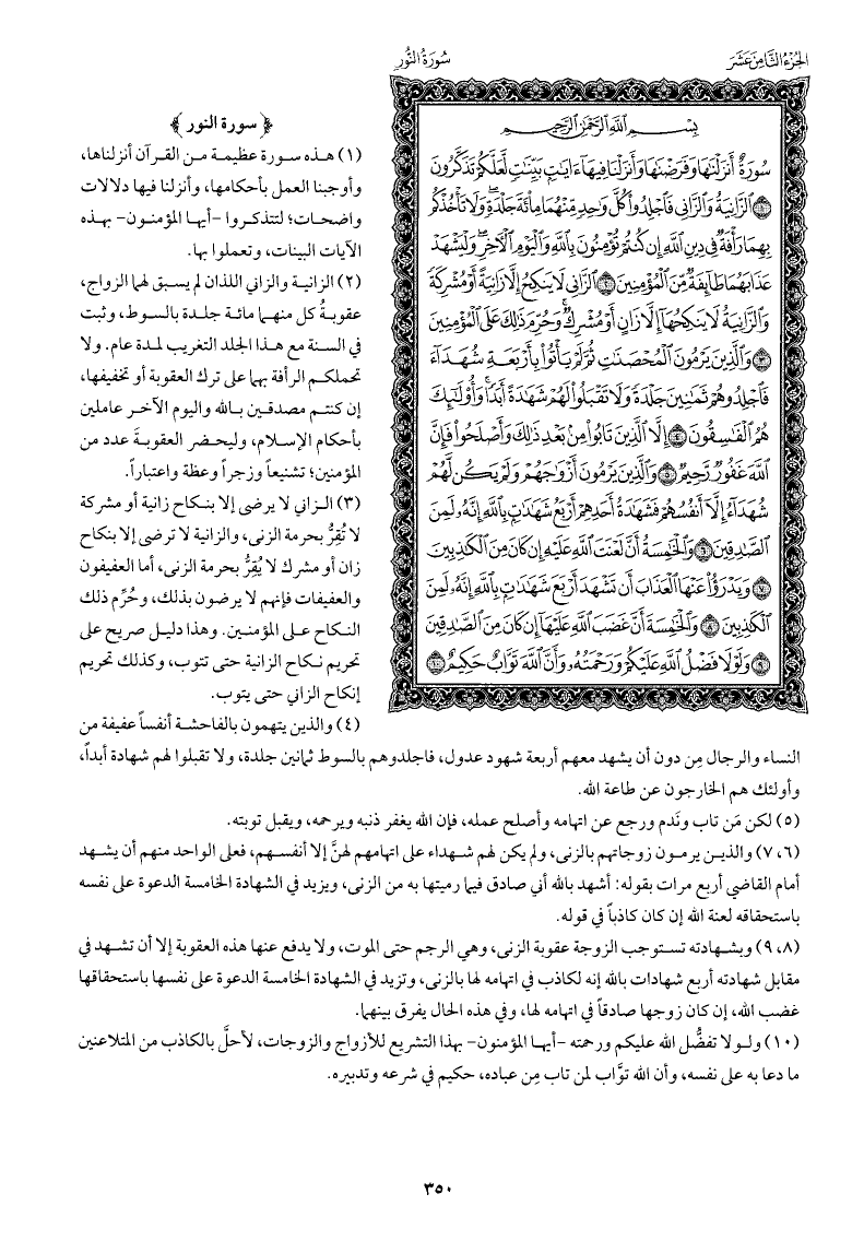 الزانية والزاني اللذان لم يسبق لهما الزواج، عقوبةُ كل منهما مائة جلدة بالسوط، وثبت في السنة مع هذا الجلد التغريب لمدة عام. ولا تحملكم الرأفة بهما على ترك العقوبة أو تخفيفها، إن كنتم مصدقين بالله واليوم الآخر عاملين بأحكام الإسلام، وليحضر العقوبةَ عدد من المؤمنين; تشنيعًا وزجرًا وعظة واعتبارًا.