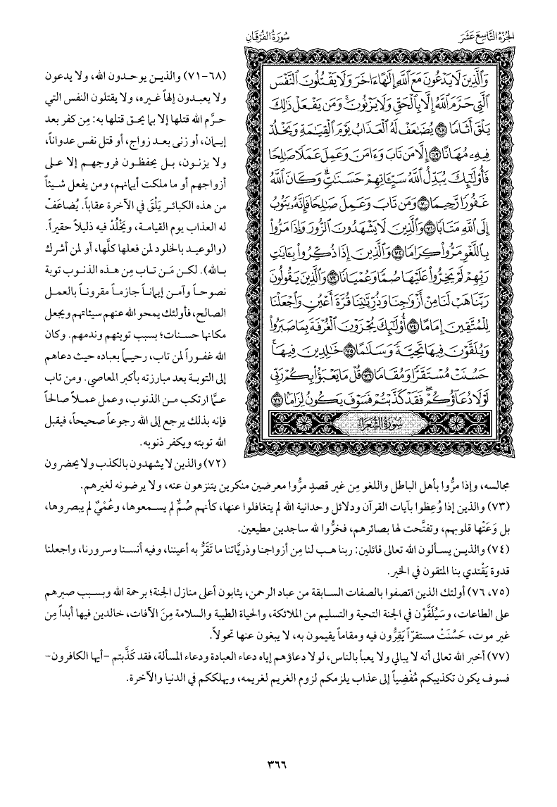 والذين يوحدون الله، ولا يدعون ولا يعبدون إلهًا غيره، ولا يقتلون النفس التي حرَّم الله قتلها إلا بما يحق قتلها به: من كفر بعد إيمان، أو زنى بعد زواج، أو قتل نفس عدوانًا، ولا يزنون، بل يحفظون فروجهم، إلا على أزواجهم أو ما ملكت أيمانهم، ومن يفعل شيئًا من هذه الكبائر يَلْقَ في الآخرة عقابًا. يُضاعَفْ له العذاب يوم القيامة، ويَخْلُدْ فيه ذليلا حقيرًا. (والوعيد بالخلود لمن فعلها كلَّها، أو لمن أشرك بالله) . لكن مَن تاب مِن هذه الذنوب توبة نصوحًا وآمن إيمانًا جازمًا مقرونًا بالعمل الصالح، فأولئك يمحو الله عنهم سيئاتهم ويجعل مكانها حسنات؛ بسبب توبتهم وندمهم. وكان الله غفورًا لمن تاب، رحيمًا بعباده حيث دعاهم إلى التوبة بعد مبارزته بأكبر المعاصي. ومن تاب عمَّا ارتكب من الذنوب، وعمل عملا صالحا فإنه بذلك يرجع إلى الله رجوعًا صحيحًا، فيقبل الله توبته ويكفر ذنوبه.