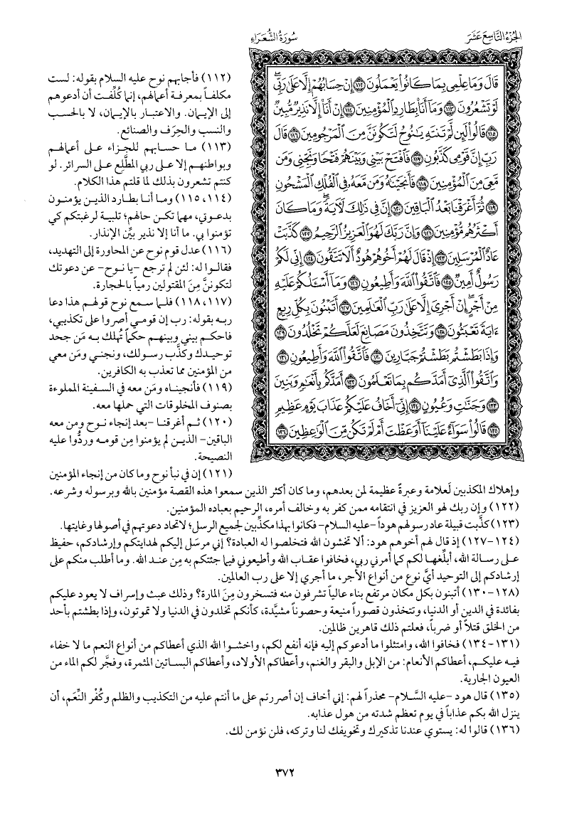 إذ قال لهم أخوهم هود: ألا تخشون الله فتخلصوا له العبادة؟ إني مرسَل إليكم لهدايتكم وإرشادكم، حفيظ على رسالة الله، أبلِّغها لكم كما أمرني ربي، فخافوا عقاب الله وأطيعوني فيما جئتكم به من عند الله. وما أطلب منكم على إرشادكم إلى التوحيد أيَّ نوع من أنواع الأجر، ما أجري إلا على رب العالمين.