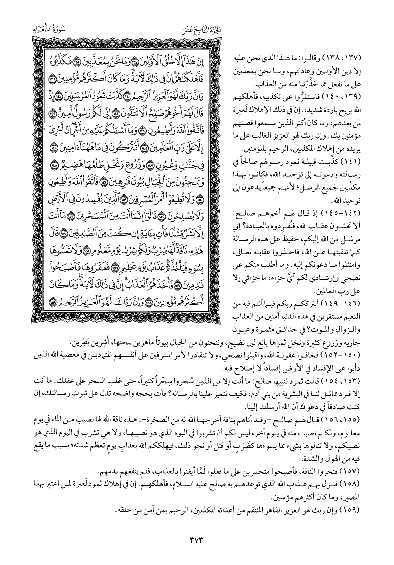 إذ قال لهم أخوهم صالح: ألا تخشون عقاب الله، فتُفرِدونه بالعبادة؟ إني مرسَل من الله إليكم، حفيظ على هذه الرسالة كما تلقيتها عن الله، فاحذروا عقابه تعالى، وامتثلوا ما دعوتكم إليه. وما أطلب منكم على نصحي وإرشادي لكم أي جزاء، ما جزائي إلا على رب العالمين.