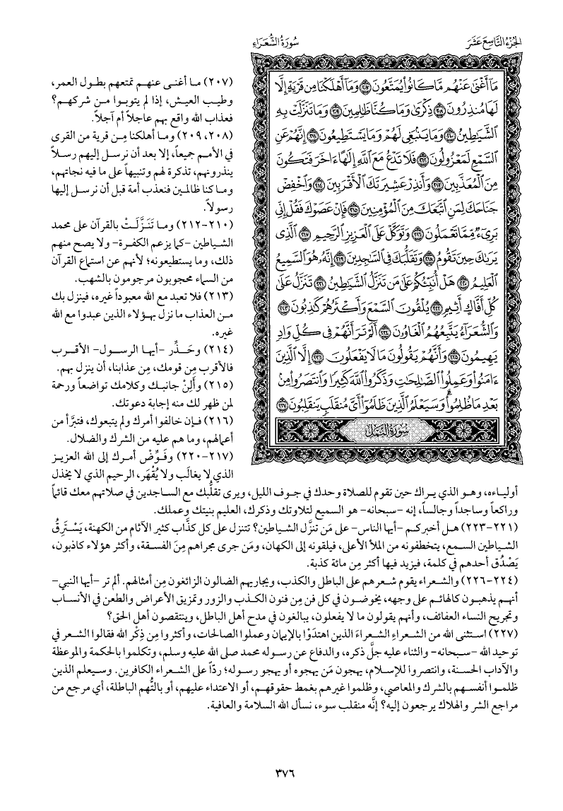 استثنى الله من الشعراءِ الشعراءَ الذين اهتدَوْا بالإيمان وعملوا الصالحات، وأكثروا مِن ذِكْر الله فقالوا الشعر في توحيد الله -سبحانه- والثناء عليه جلَّ ذكره، والدفاع عن رسوله محمد صلى الله عليه وسلم، وتكلموا بالحكمة والموعظة والآداب الحسنة، وانتصروا للإسلام، يهجون مَن يهجوه أو يهجو رسوله، ردًّا على الشعراء الكافرين. وسيعلم الذين ظلموا أنفسهم بالشرك والمعاصي، وظلموا غيرهم بغمط حقوقهم، أو الاعتداء عليهم، أو بالتُّهم الباطلة، أي مرجع من مراجع الشر والهلاك يرجعون إليه؟ إنَّه منقلب سوء، نسأل الله السلامة والعافية.