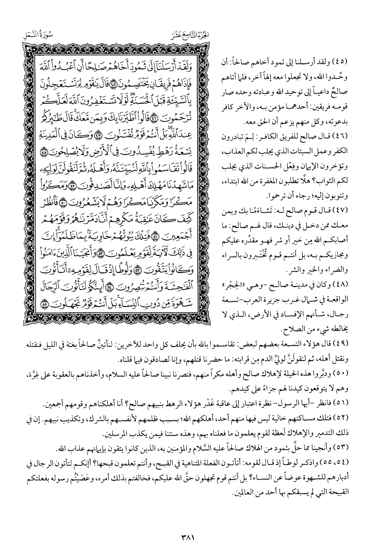 قال صالح للفريق الكافر: لِمَ تبادرون الكفر وعمل السيئات الذي يجلب لكم العذاب، وتؤخرون الإيمان وفِعْل الحسنات الذي يجلب لكم الثواب؟ هلا تطلبون المغفرة من الله ابتداء، وتتوبون إليه؛ رجاء أن ترحموا.
