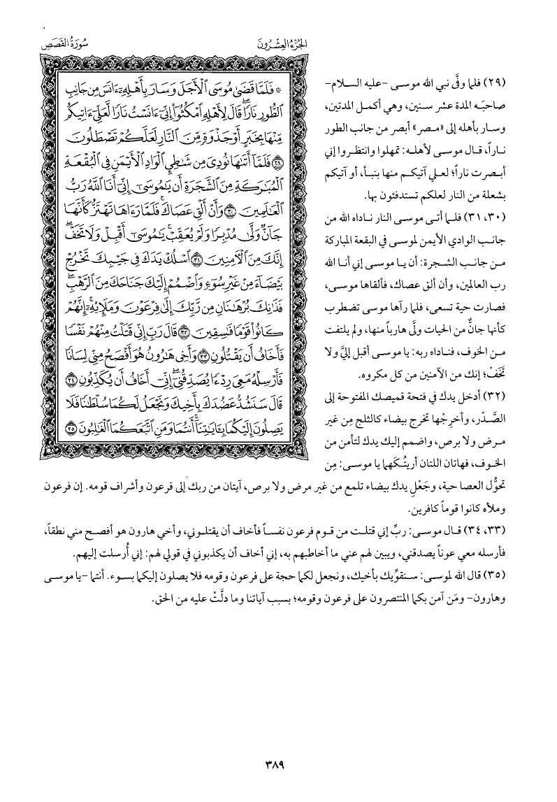 أدخل يدك في فتحة قميصك المفتوحة إلى الصدر، وأخرجها تخرج بيضاء كالثلج مِن غير مرض ولا برص، واضمم إليك يدك لتأمن من الخوف، فهاتان اللتان أريتُكَهما يا موسى: مِن تحوُّل العصا حية، وجَعْلِ يدك بيضاء تلمع من غير مرض ولا برص، آيتان من ربك إلى فرعون وأشراف قومه. إن فرعون وملأه كانوا قومًا كافرين.