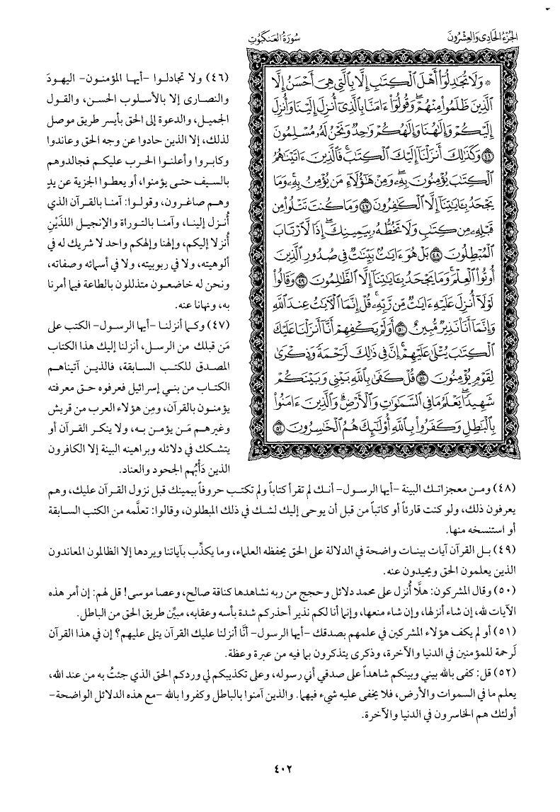 ولا تجادلوا -أيها المؤمنون- اليهودَ والنصارى إلا بالأسلوب الحسن، والقول الجميل، والدعوة إلى الحق بأيسر طريق موصل لذلك، إلا الذين حادوا عن وجه الحق وعاندوا وكابروا وأعلنوا الحرب عليكم فجالدوهم بالسيف حتى يؤمنوا، أو يعطوا الجزية عن يدٍ وهم صاغرون، وقولوا: آمنا بالقرآن الذي أُنزل إلينا، وآمنا بالتوراة والإنجيل اللذَيْن أُنزلا إليكم، وإلهنا وإلهكم واحد لا شريك له في ألوهيته، ولا في ربوبيته، ولا في أسمائه وصفاته، ونحن له خاضعون متذللون بالطاعة فيما أمرنا به، ونهانا عنه.