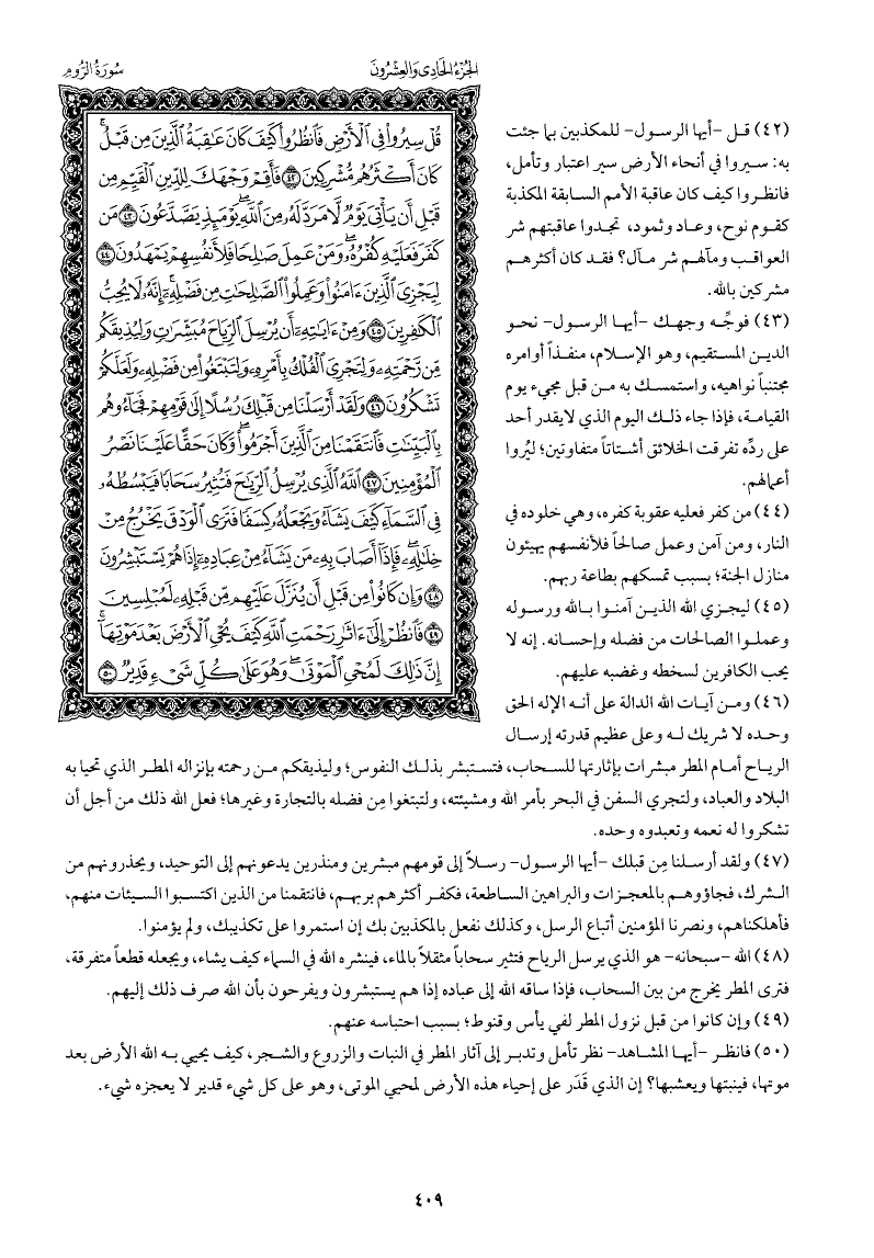 فانظر -أيها المشاهد- نظر تأمل وتدبر إلى آثار المطر في النبات والزروع والشجر، كيف يحيي به الله الأرض بعد موتها، فينبتها ويعشبها؟ إن الذي قَدَر على إحياء هذه الأرض لمحيي الموتى، وهو على كل شيء قدير لا يعجزه شيء.