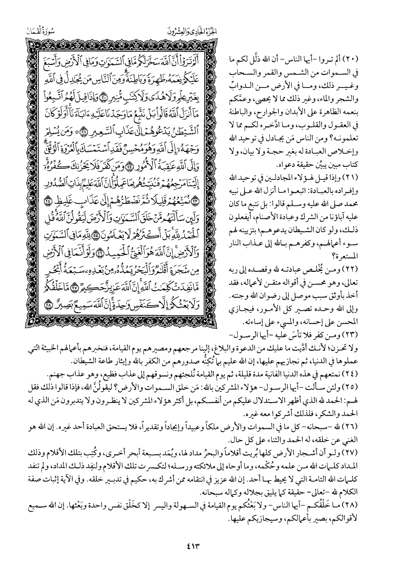 ولو أن أشجار الأرض كلها بُريت أقلامًا والبحر مداد لها، ويُمَد بسبعة أبحر أخرى، وكُتِب بتلك الأقلام وذلك المداد كلمات الله من علمه وحكمه، وما أوحاه إلى ملائكته ورسله؛ لتكسرت تلك الأقلام، ولنفِد ذلك المداد، ولم تنفد كلمات الله التامة التي لا يحيط بها أحد. إن الله عزيز في انتقامه ممن أشرك به، حكيم في تدبير خلقه. وفي الآية إثبات صفة الكلام لله -تعالى- حقيقة كما يليق بجلاله وكماله سبحانه.