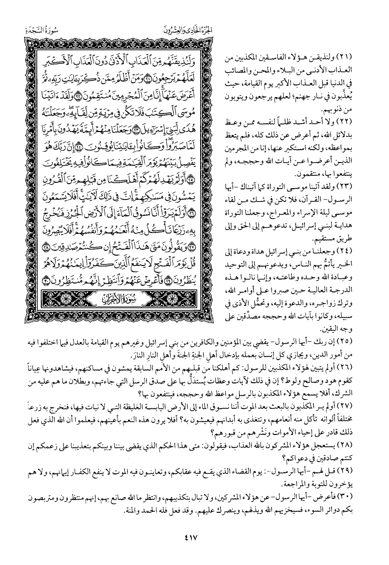 ولنذيقن هؤلاء الفاسقين المكذبين من العذاب الأدنى من البلاء والمحن والمصائب في الدنيا قبل العذاب الأكبر يوم القيامة، حيث يُعذَّبون في نار جهنم؛ لعلهم يرجعون ويتوبون من ذنوبهم.