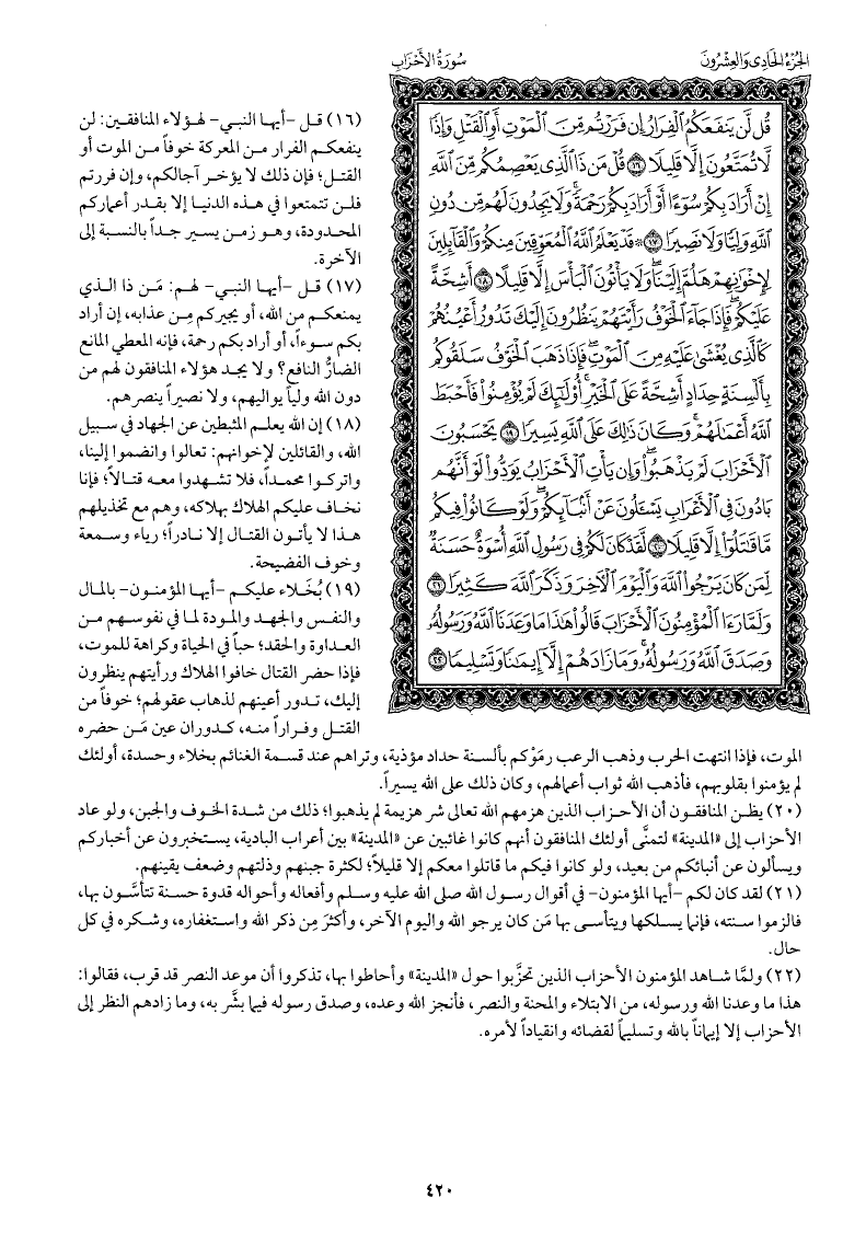 يظن المنافقون أن الأحزاب الذين هزمهم الله تعالى شر هزيمة لم يذهبوا؛ ذلك من شدة الخوف والجبن، ولو عاد الأحزاب إلى «المدينة» لتمنَّى أولئك المنافقون أنهم كانوا غائبين عن «المدينة» بين أعراب البادية، يستخبرون عن أخباركم ويسألون عن أنبائكم، ولو كانوا فيكم ما قاتلوا معكم إلا قليلا لكثرة جبنهم وذلتهم وضعف يقينهم.