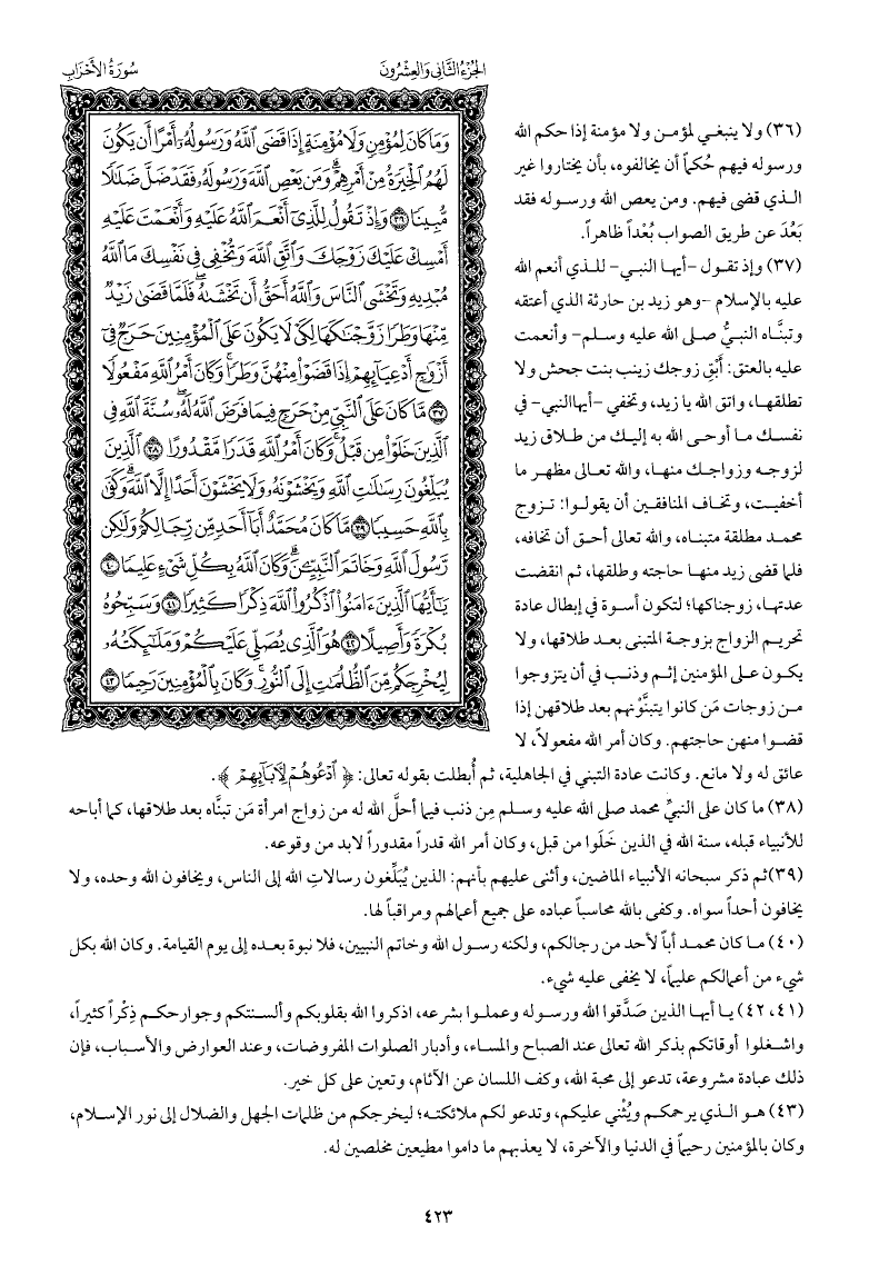 وإذ تقول -أيها النبي- للذي أنعم الله عليه بالإسلام -وهو زيد بن حارثة الذي أعتقه وتبنَّاه النبيُّ صلى الله عليه وسلم- وأنعمت عليه بالعتق: أَبْقِ زوجك زينب بنت جحش ولا تطلقها، واتق الله يا زيد، وتخفي -يا محمد- في نفسك ما أوحى الله به إليك من طلاق زيد لزوجه وزواجك منها، والله تعالى مظهر ما أخفيت، وتخاف المنافقين أن يقولوا: تزوج محمد مطلقة متبناه، والله تعالى أحق أن تخافه، فلما قضى زيد منها حاجته، وطلقها، وانقضت عدتها، زوجناكها; لتكون أسوة في إبطال عادة تحريم الزواج بزوجة المتبنى بعد طلاقها، ولا يكون على المؤمنين إثم وذنب في أن يتزوجوا من زوجات من كانوا يتبنَّوْنهم بعد طلاقهن إذا قضوا منهن حاجتهم. وكان أمر الله مفعولا لا عائق له ولا مانع. وكانت عادة التبني في الجاهلية، ثم أُبطلت بقوله تعالى: {ادْعُوهُمْ لآبَائِهِمْ} .